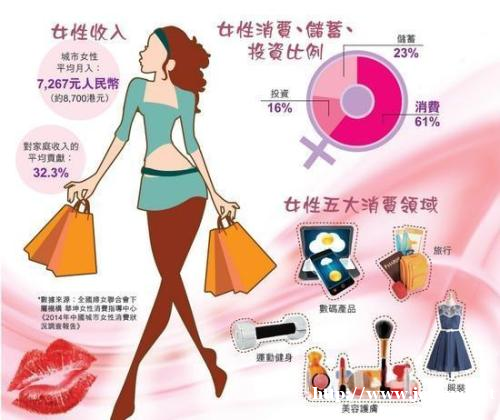 女性消费市场是一个潜力极大的广阔市场。据第三次人口普查统计,我国女性消费者有4.8亿之多,占全国人口的48.7%,其中在消费活动中有较大影响的是中青年妇女,即20- 50岁这一年龄段的女性,约占人口总数的21%。女性消费者不仅数量大,而且在购买活动中起着特殊重要的作用。她们不仅对自己所需的消费品进行购买决策,在家庭中,由她们承担了母亲、女儿、妻子、主妇等多种角色